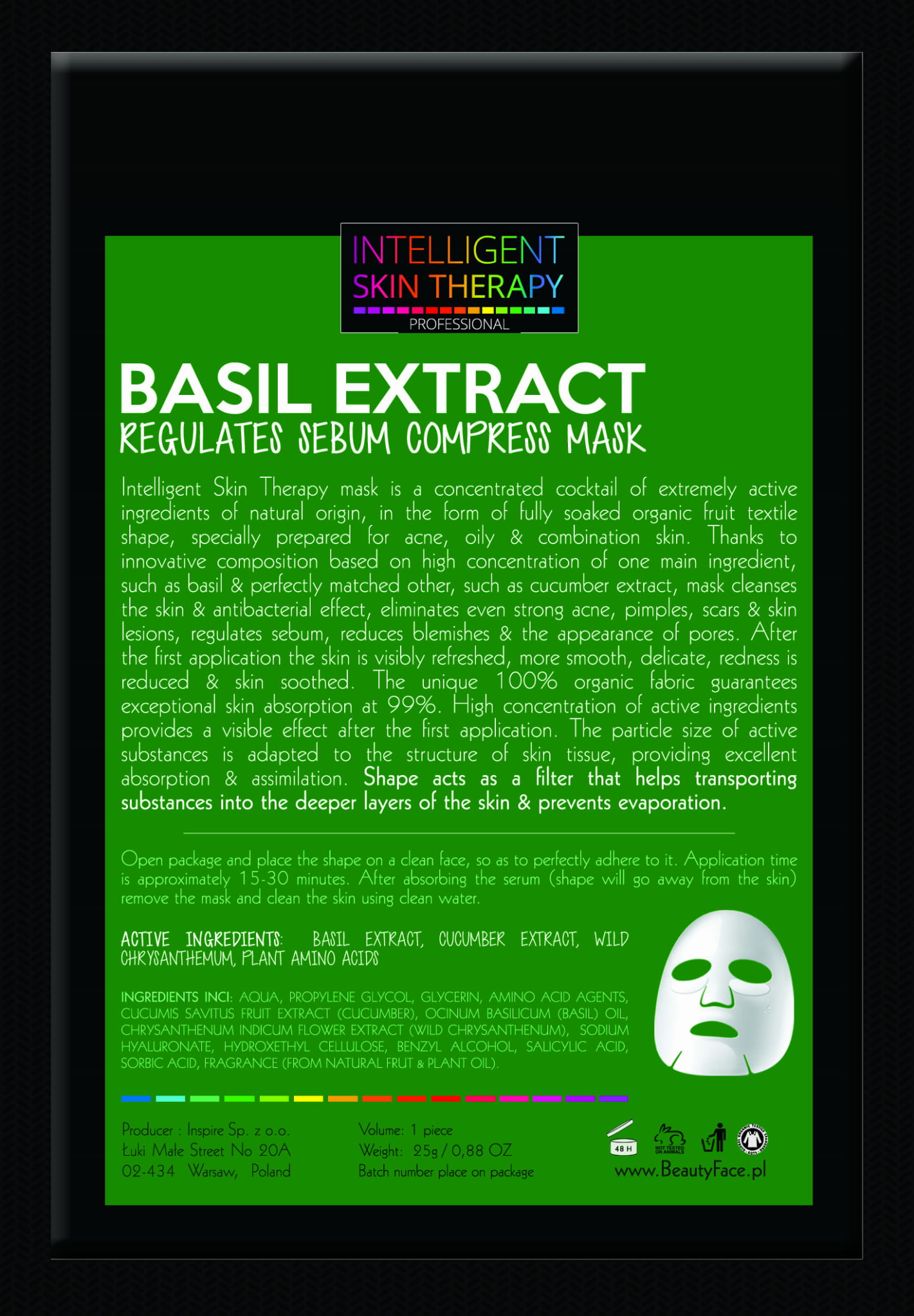 Maska INTELLIGENT SKIN THERAPY to skondensowany koktajl wyjątkowo aktywnych czynnych składników pochodzenia naturalnego, w postaci silnie nasączonego bawełnianego płata. Inteligentna pielęgnacja skóry oparta została o unikalną kompozycję, w której składnikiem dominującym jest skondensowany ekstrakt z bazylii o działaniu silnie oczyszczającym i usuwającym toksyny maska głęboko oczyszcza skórę, zmniejsza wypryski i zmiany skórne, reguluje wydzielanie sebum, zmniejsza widoczność porów oraz wspomaga walkę z trądzikiem. Dodatkowo ekstrakt z ogórka i chryzantemy widocznie rozjaśniają skórę, niwelują przebarwienia i zmiany skórne oraz wzmacniają. Skóra jest widocznie odświeżona, staje się bardziej gładka, delikatna, zaczerwienienia zostają złagodzone a skóra wyciszona.