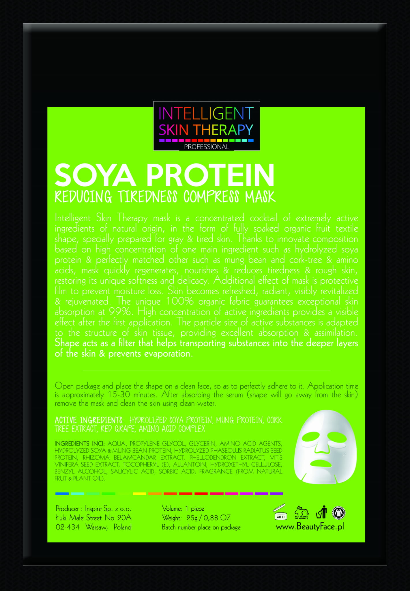 Maska INTELLIGENT SKIN THERAPY to skondensowany koktajl wyjątkowo aktywnych czynnych składników pochodzenia naturalnego, w postaci silnie nasączonego bawełnianego płata. Inteligentna pielęgnacja skóry oparta została o unikalną kompozycję, w której składnikiem dominującym jest hydrolityczne białko sojowe, które bardzo szybko regeneruje szorstką skórę, przywracając jej wyjątkową miękkość i delikatność.