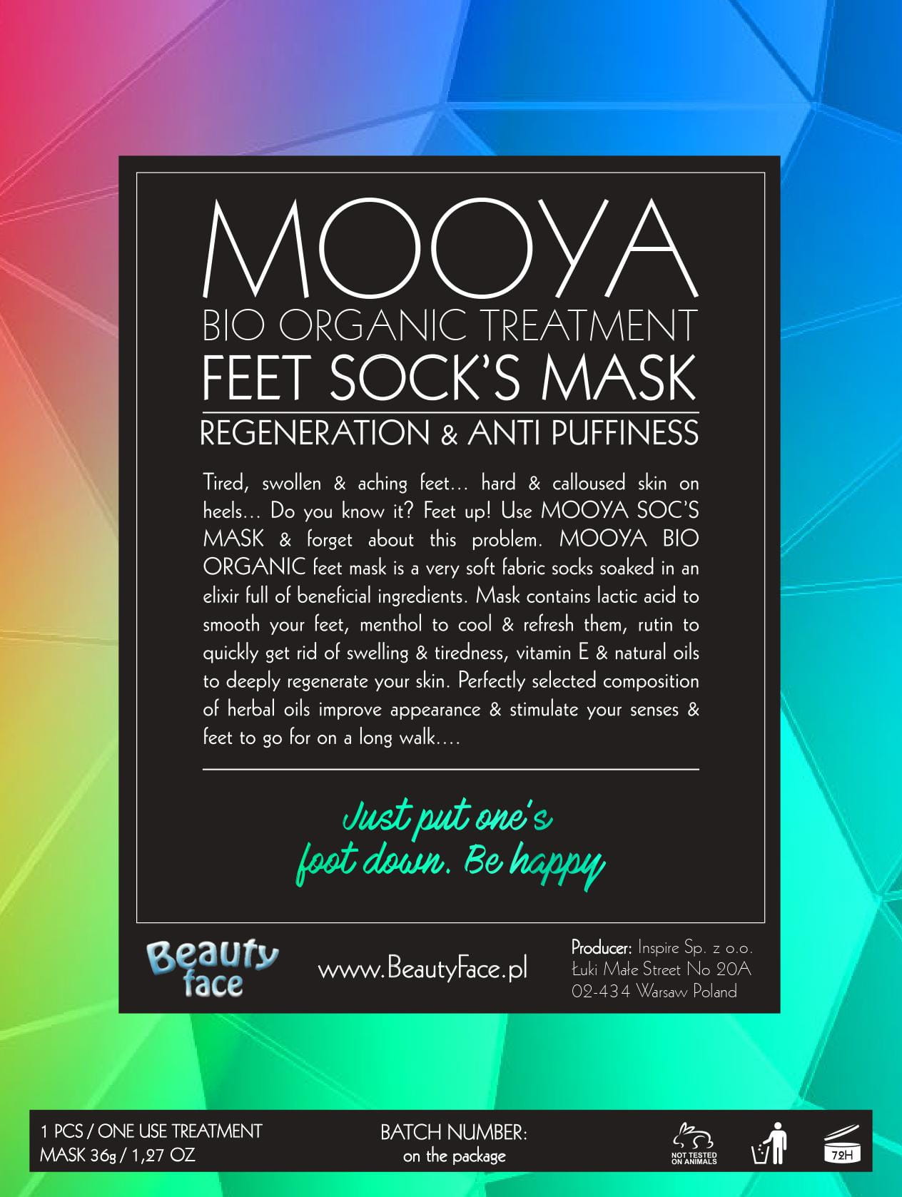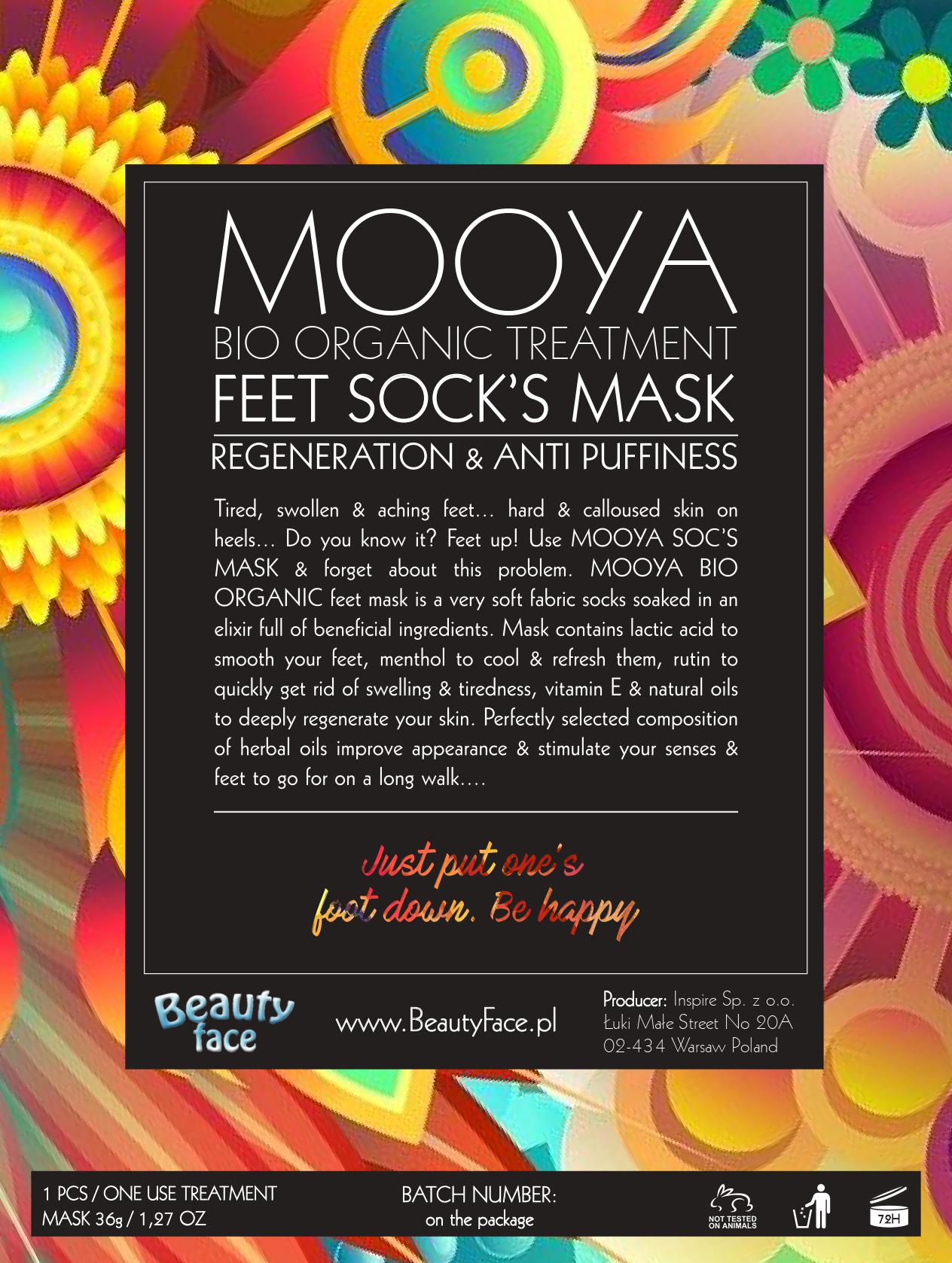 Zmęczone, opuchnięte i bolące stopy... twarda i zrogowaciała skóra na piętach... Znasz to? Maseczka do stóp MOOYA BIO ORGANIC to bardzo miękkie skarpetki z tkaniny nasączone eliksirem pełnym dobroczynnych składników. Maska zawiera kwas mlekowy, który wygładza stopy oraz usuwa zrogowaciały naskórek, mentol i rutynę, aby szybko pozbyć się obrzęków i zmęczenia, witaminę E i naturalne olejki ziołowe, które głęboko zregenerują skórę. Idealnie dobrana kompozycja olejków ziołowych poprawia wygląd oraz pobudza zmysły i stopy do długich spacerów....